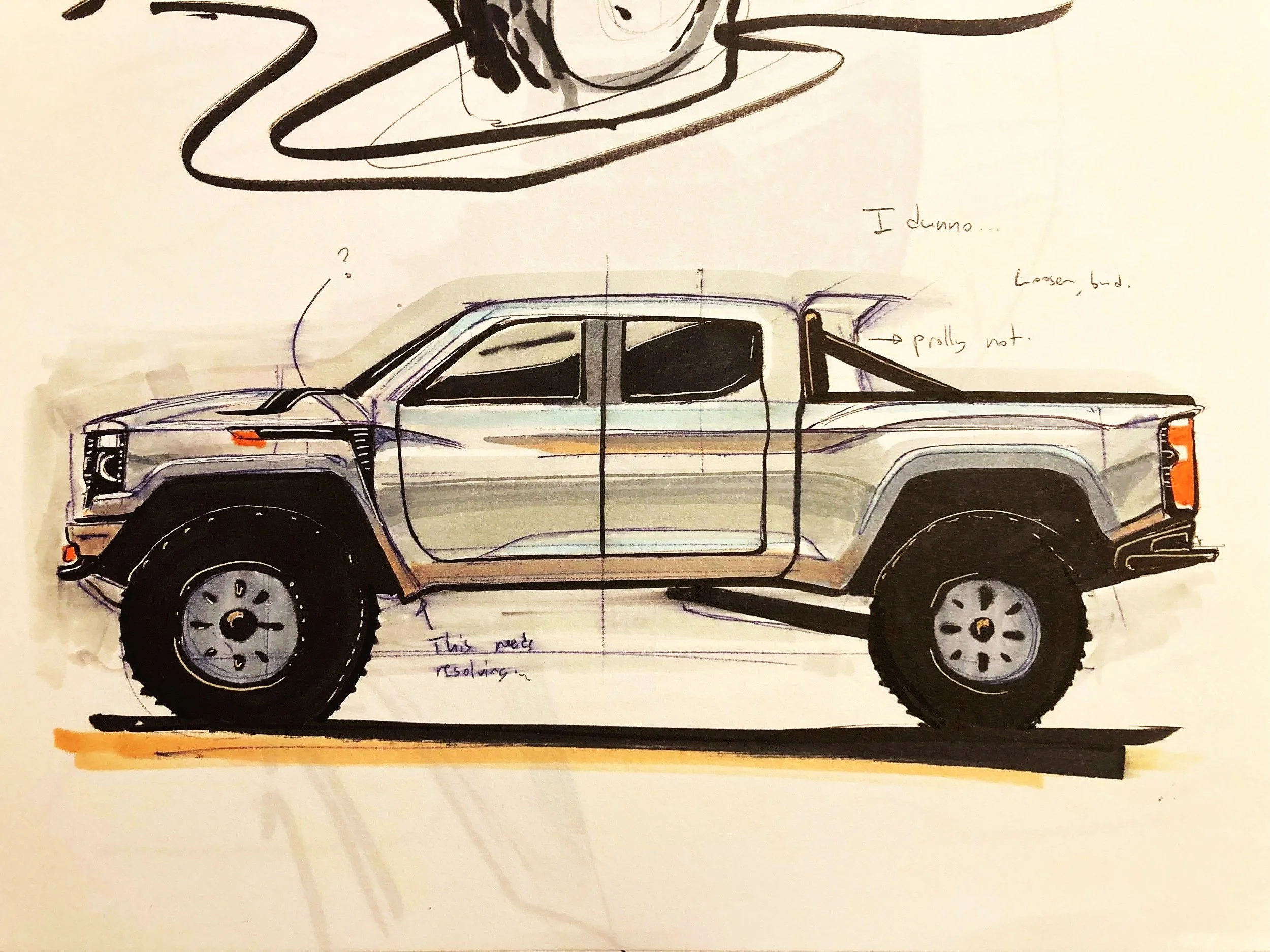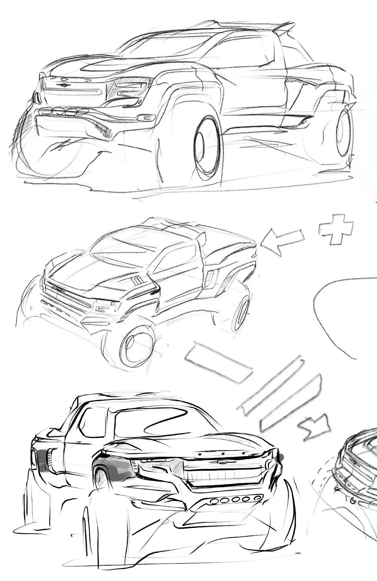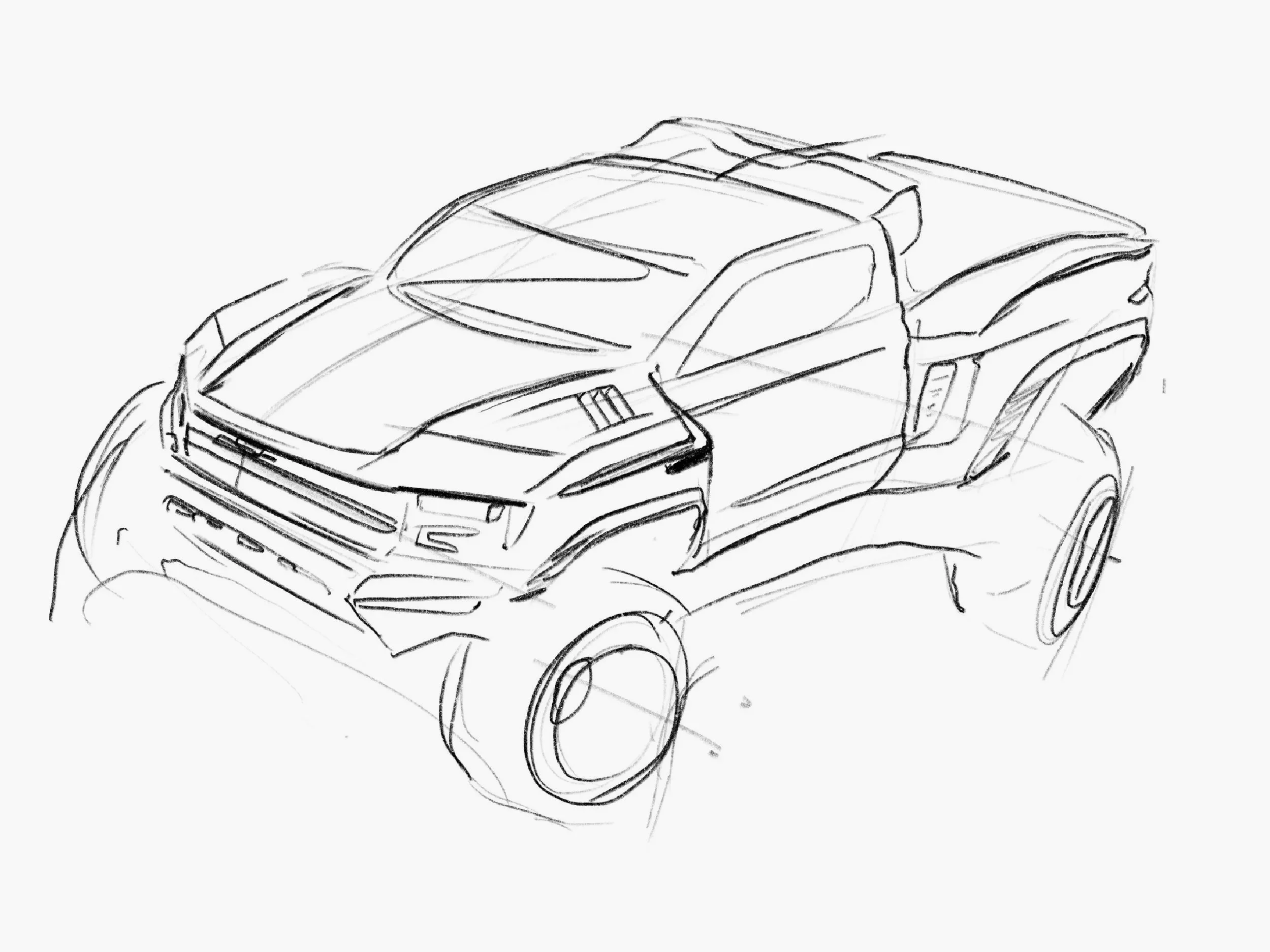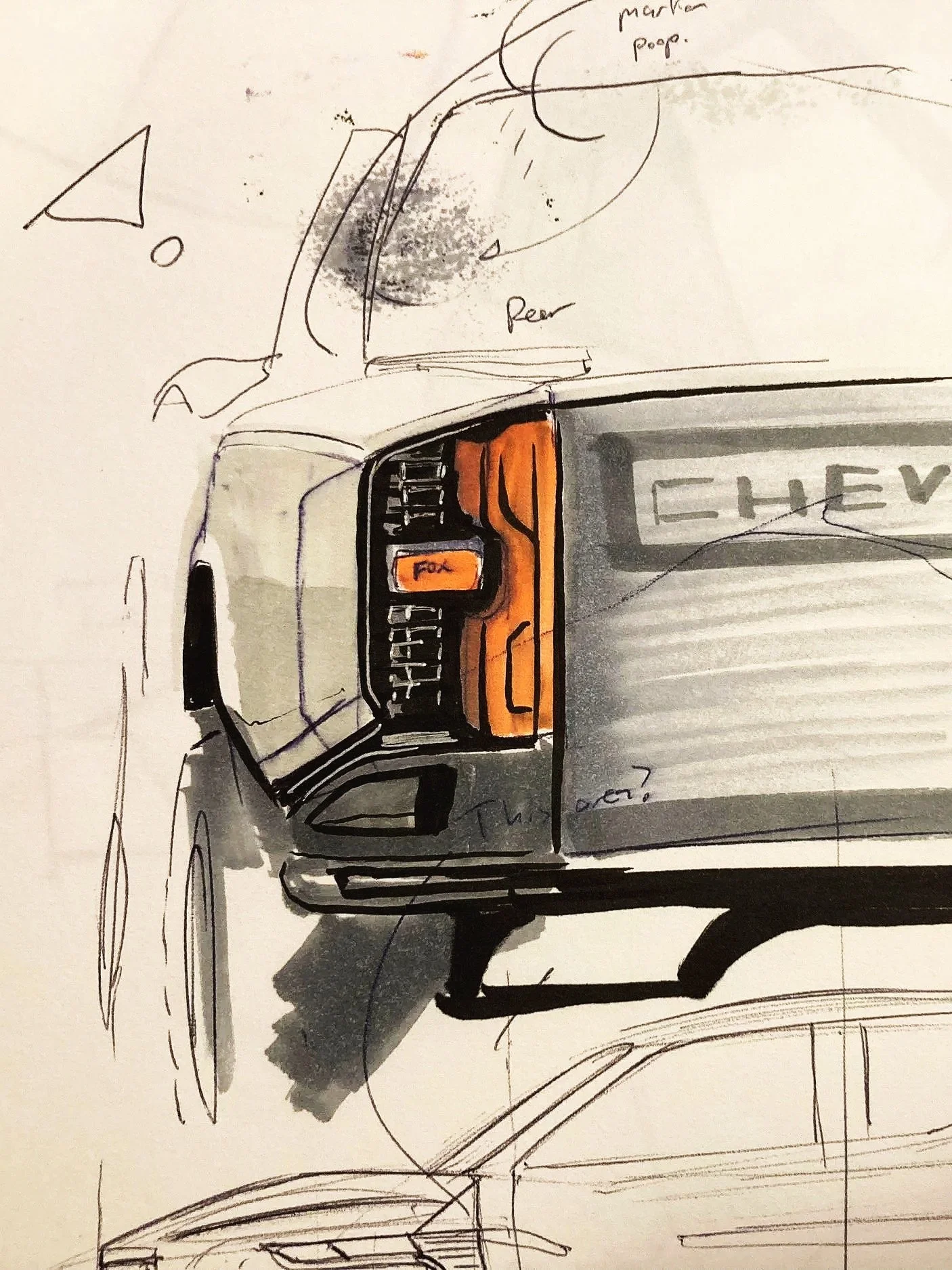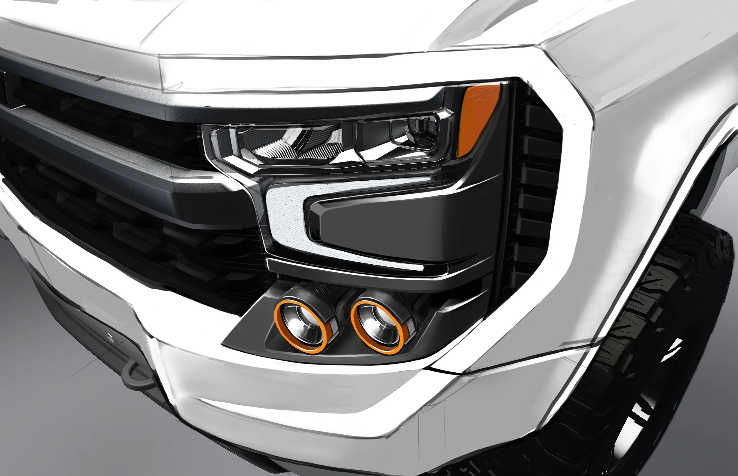 The final design became a tamer version of the “Full On T.T.” concept, smoothing out the faceted surfaces to better match the design language of the Silverado, and then refining the tube steel bumpers to something that better resembles an actual trophy truck’s space frame construction. The front fender vent and the flat-top rear fenders were added to the mix from the “Heritage” concept, creating a less outlandish design that eventually made it to production. Other design team members refined the details of this design, such as the hood vent, front and rear fender vents, chase rack, bumper details, and the light holsters around the headlights.