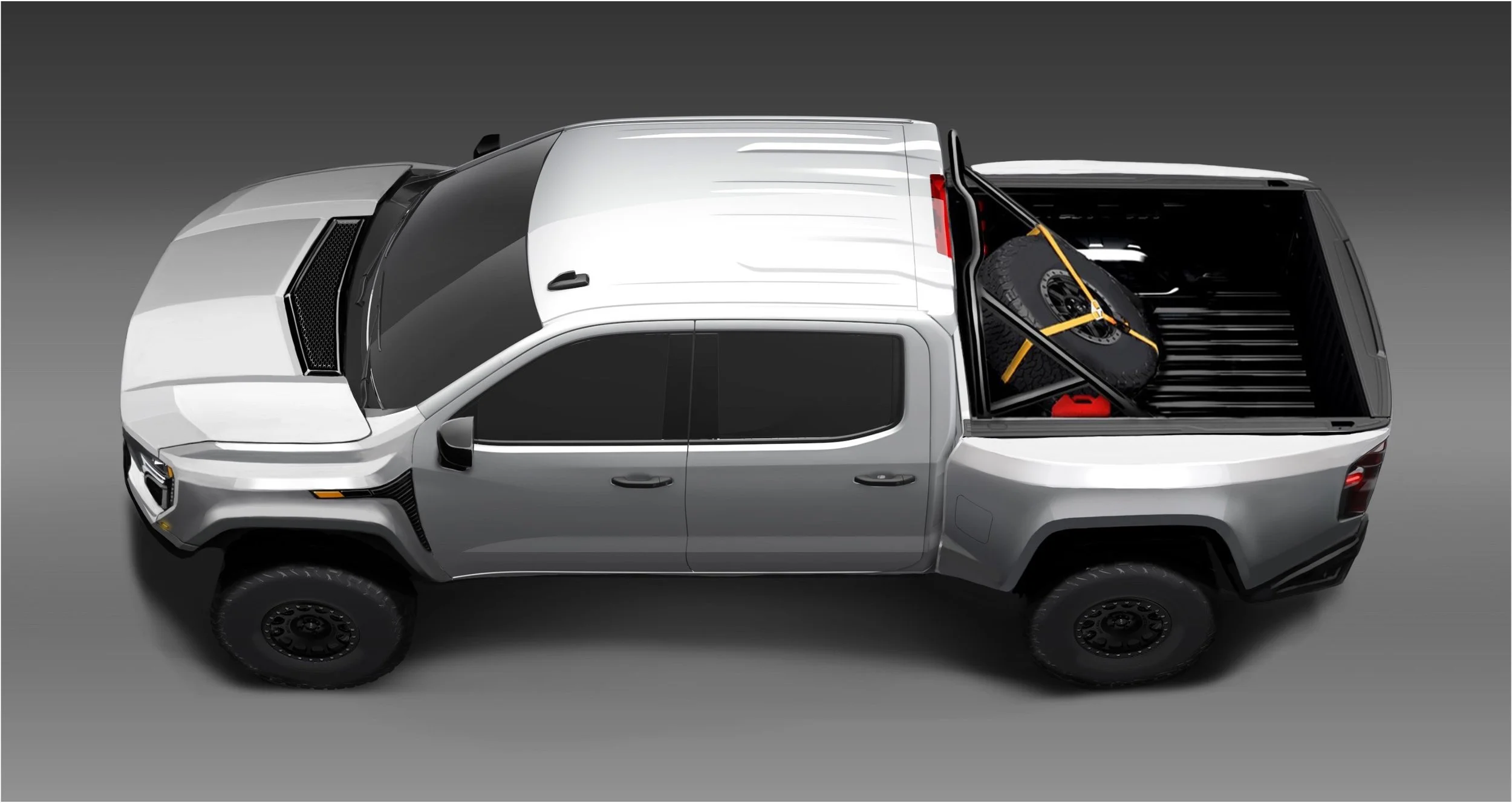If old school was not the wave for the audience in question, then modern race vehicles might be the answer. With the “Full On T.T.” concept, the goal was to take as many signature features of a modern trophy truck as possible and cram them onto the Silverado framework. Bulging fenders, tube steel accents, and the signature “dogbone” sillouhette of modern racers define the key features of this concept. Hard edges and polygonal chamfered surfaces add a touch of tech flavor as a nod to the Fox Factory design language.