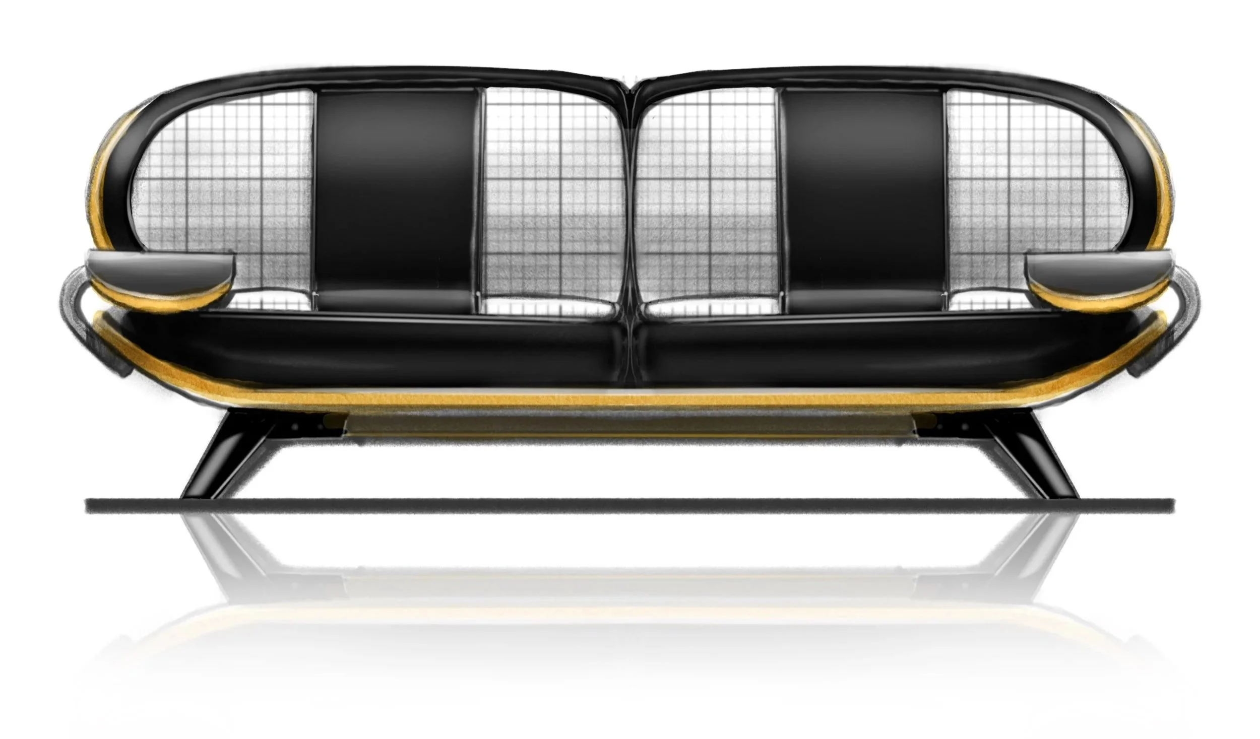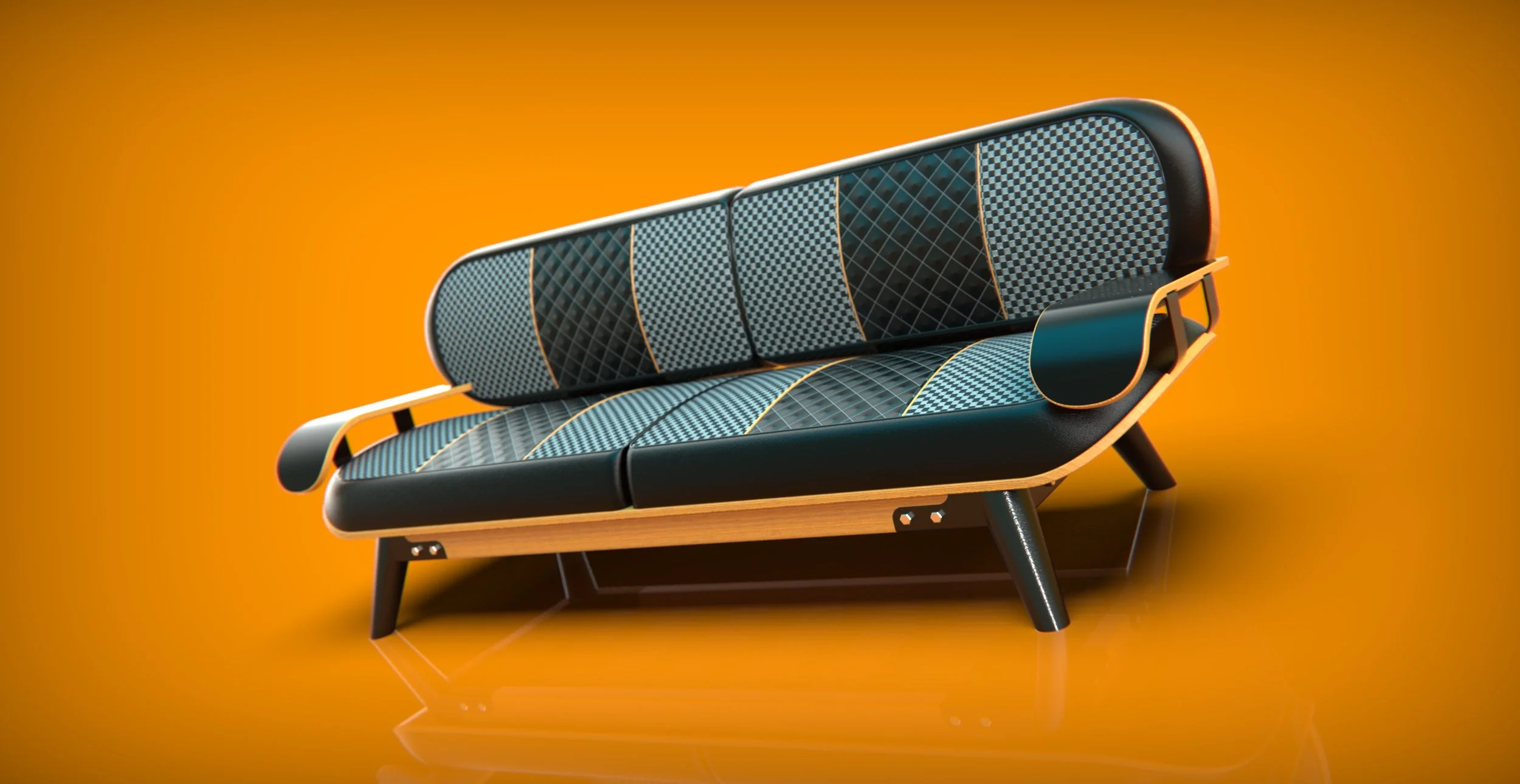 Sketching was fast and rough, spewing ideas all over the page for each little detail about this sofa. How is it out together? What does some of the joinery look like? Does it fold, or does it simply disassemble? A small doodle of an oval shape sofa made the project click. It had a sort of skateboard aesthetic, informing the idea of two scaled-up skateboards bolted together. Skateboards are pretty thin and easy to carry…what does that look like when it becomes a sofa? The rest of the creative process followed this thought.