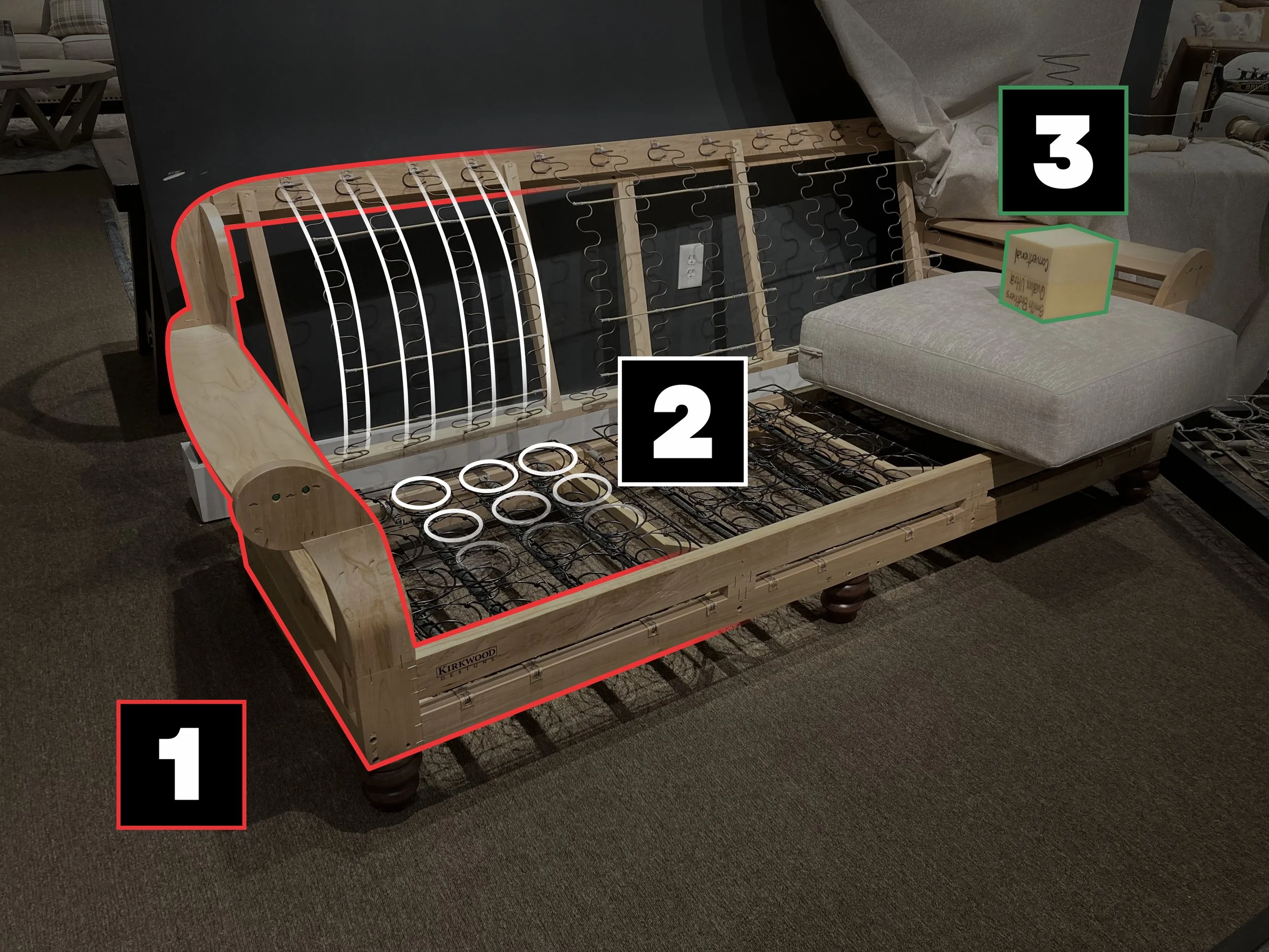 The cushions are typically made of mixed density foams layered on top of each other. These sit on top of the springs and create that nice, plushy landing space sofas provide. They also distribute the weight of a person across the springs so no pressure points occur in a single area on the user’s body.